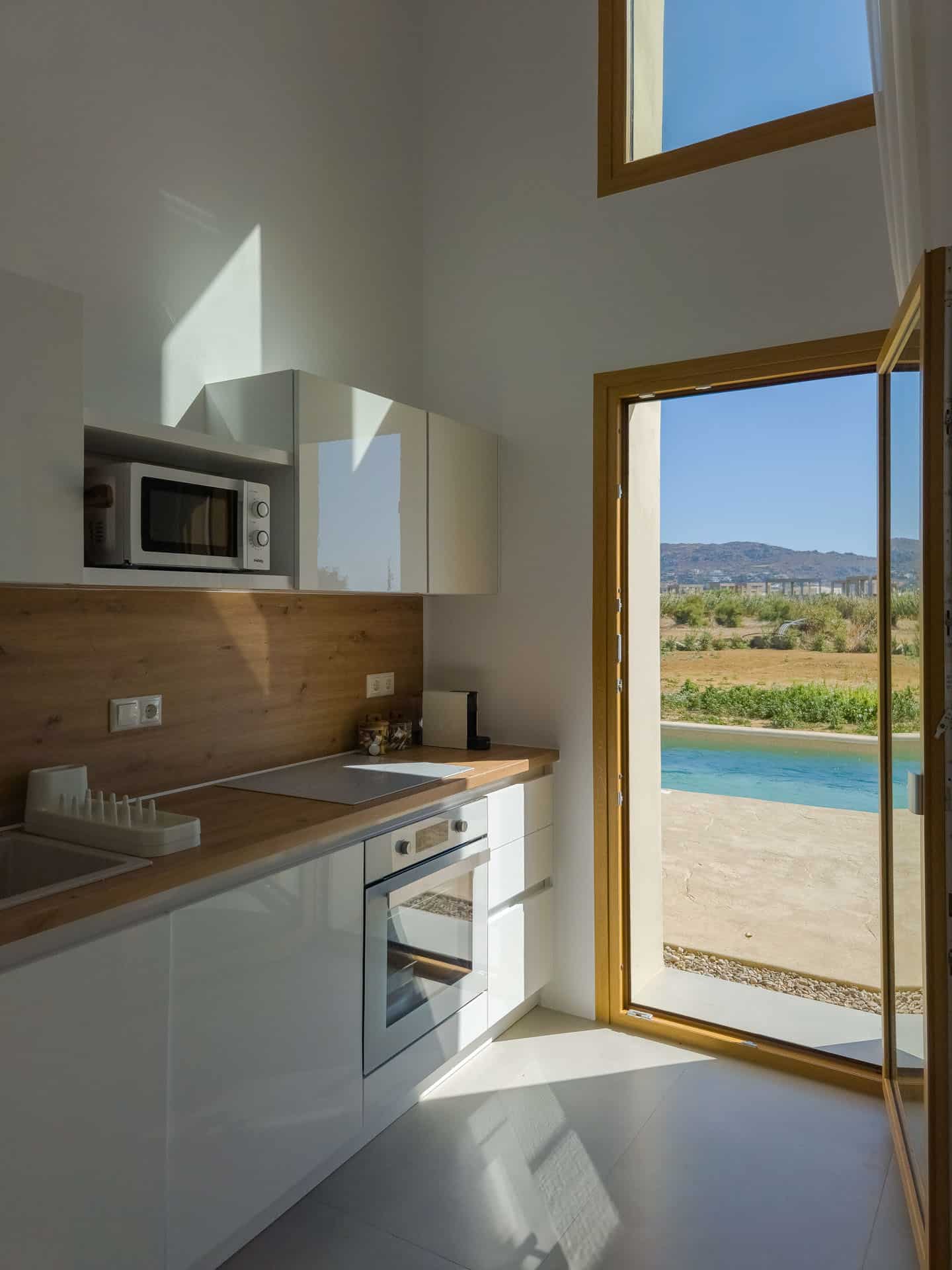 The house features two comfortable bedrooms, an airy open living space filled with natural light, and elegant minimalist design throughout. The high ceilings create a sense of openness and calm, while large openings connect the indoors with the garden and pool area.